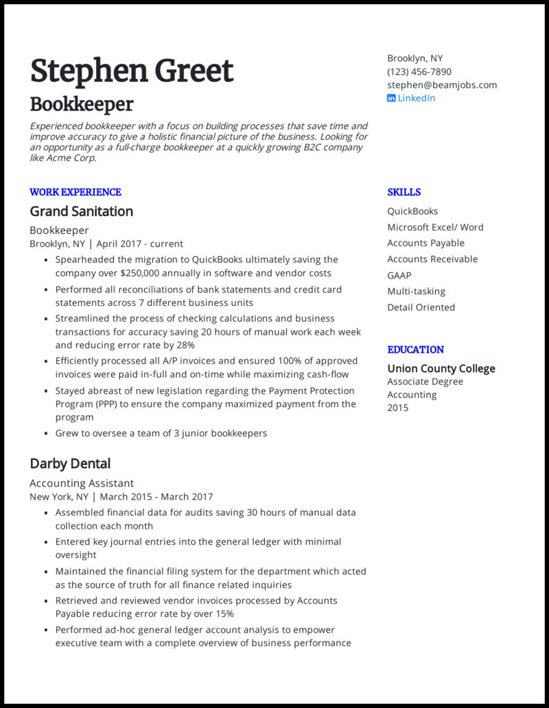March 03, 2021Bookkeeper Resume Example A proven job specific resume sample for landing your next job in 2020. You can edit this Bookkeeper resume example to get a quick start and easily build a perfect resume in just a few minutes. Just fill in your details, download your new resume & start your job application today! Bookkeeper Resume Objectives Bookkeeping positions can be a great start to a career in accounting while you work toward professional accreditation, but with the right company they canalso provide a lifelong vocation that contributes meaningfully to the long-term success of the organization. Accounting resume sample Could